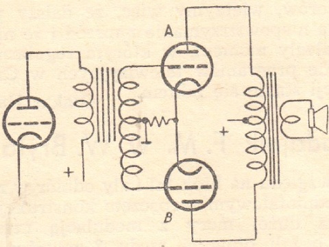 Łączenie "przeciwsobne" lamp ostatniego stopnia wzmacniaczy stosuje się wszędzie tam, gdzie moc akustyczna przekracza cyfrę rzędu 10 watów. Najważniejszym powodem po temu jest transformator wyjściowy.