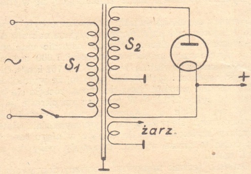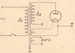 Prostownik najprostszy - prostowanie jednopołówkowe. Uzwojenie S2, załączone między anodą lampy i chassis aparatu. Wysokie napięcie stałe wyprostowane otrzymujemy z katody lampy. W wypadku lampy żarzonej pośrednio źródłem napięcia stałego jest katoda (odizolowana od grzejnika).