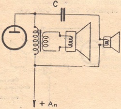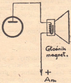 W takim przypadku końcówkę cewki głośnika oznaczoną znakiem "+" lub kolorem "czerwonym" łączy się z przewodem "plusowym" napięcia anodowego otrzymywanego z baterii anodowej lub zasilacza sieciowego. Drugą końcówkę cewki głośnika oznaczoną znakiem "-" lub kolorem niebieskim albo czarnym łączy się wówczas w podstawce lampowej z nóżką należącą do anody lampy głośnikowej. Schemat takiego połączenia pokazany jest na rys. 1.
