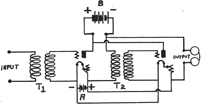 The circuit diagram for an amplifier of this type is shown herewith. The posts marked "input" are connected to the primary of the amplifying transformer on one side, and the current from the pair of binding posts marked "teleephones" on the detector panel forms the external circuit, in this case. The two binding posts at the upper left are the ones used for this purpose. There is then a current induced in the secondary of the transformer, T1f whenever a signal passes thru the primary. This in turn affects the grid of the first aníplifier tube, whose output goes to the primary of the second amplifying transformer, T2, and from the secondary of the secondary of this, to the grid of the second tube. The telephones are then connected to the output circuit of this tube, as shown. Binding posts for use for this dass of work are mounted on the upper right side of the panel, opposite the posts marked "input," but the telephones connect to the "output" posts.