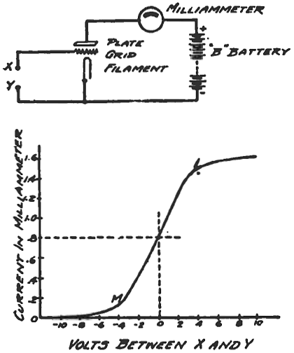 The grid is charged positively or negatively by connecting the battery between the points X and Y in Fig. 1. If points X and Y are connected by a wire, and Y is connected to the negative end of the filament, the grid is said to have zero charge. By changing the voltage of the battery connected between X and Y and marking down the corresponding values of current shown by the meter we obtain the curve of Fig. 2. We note that when X and Y are connected by a wire, that is, when there is zero charge in the grid, there is a current of .8 of a milliampere in the plate circuit. This value