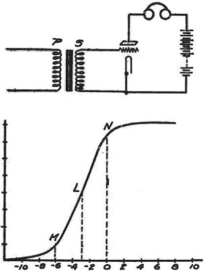 Fig. 4 shows the curve obtained from some types of amplifier tube with certain adjustments of filament and B battery. If this tube were used with the connections shown in Fig. 3, the amplified sounds would be distorted, because a positive charge of let us say two volts would increase the plate current but very little, while a negative charge of the same amount would cause a comparatively large decrease. In order to amplify without distortion it would be necessary that the increase in this case should equal the decrease. This could be brought about by connecting a battery of about three volts between the filament and the secondary of the transformer with its negative end toward the latter. This would bring the plate current to point L on the curve of Fig. 4. If the grid voltage now fluctuates two or three volts in either direction, the corresponding increase and decrease in plate current will be equal and there will be no distortion. Such a battery connected in the grid circuit is called a "C" battery or "bias" battery. Since it supplies little or no current it may consist of the smallest size of flashlight cells.