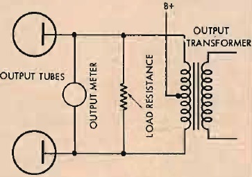 Esto es un poco difícil de verificar mediante mediciones reales. El paso más simple hacia es quitar la carga de resistencia secundaria y aplicar una carga de placa a placa en el primario, como en la Fig. 2. Si la carga secundaria fue de 16 ohmios y el transformador refiere que esto es, digamos, 6000 ohmios resistencia placa a placa, luego se debe conectar una resistencia de 6000 ohmios, de al menos 50 vatios de disipación, a través del primario. Los tubos de salida ahora suministran energía directamente a la carga, sin pasar por el transformador de salida, y ahora se puede medir en la resistencia de 6000 ohmios.