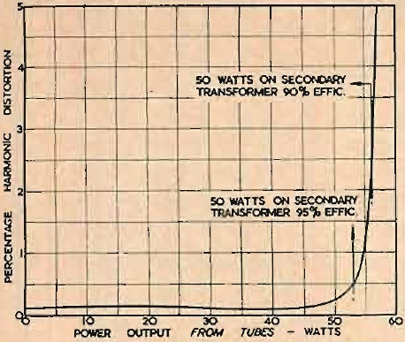 A primera vista, esto puede no parecer una pérdida muy grave. Si realiza la medición a 47 vatios en el secundario, puede evaluar correctamente su valor real. Pero desafortunadamente, los tubos de salida para dar 50 vatios rápidamente se distorsionan cuando se empujan a un nivel más alto. La característica de distorsión es similar a la que se muestra en la Fig. 3: la distorsión a los 53 vatios requeridos para dar 50 vatios de un transformador con una eficiencia del 95 por ciento puede ser sólo del 0,5 por ciento; pero para obtener los casi 56 vatios necesarios para un transformador con una eficiencia del 90 por ciento, la distorsión puede aumentar al 2,5 por ciento, o incluso más. Entonces, si la medición se realiza solo al nivel de 50 vatios medido en el secundario, se puede obtener fácilmente la impresión de que el segundo transformador de salida aumenta considerablemente la distorsión, en comparación con el primero.