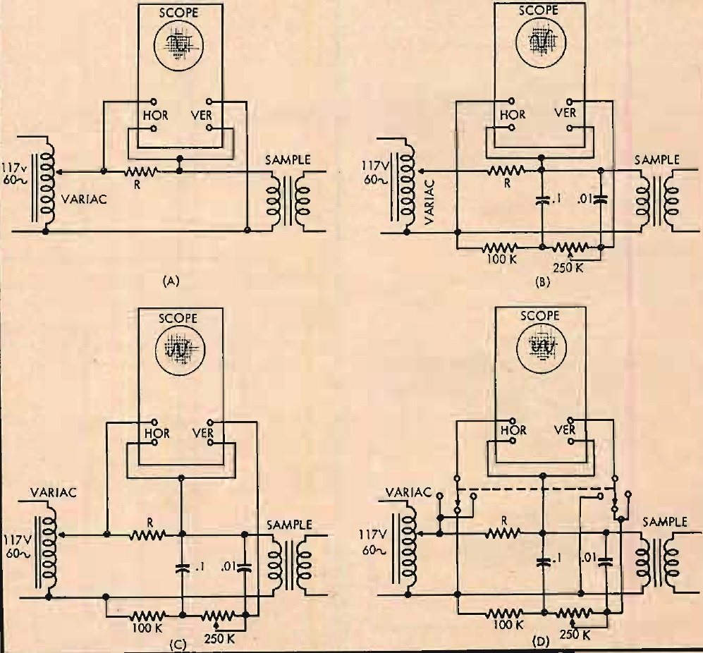 Fig. 4. Disposiciones del circuito para producir las trazas del osciloscopio: (A) la disposición para la traza de (A) en la Fig. 5; (B) conexiones para configurar 90 grados. desplazamiento de fase, ajustando para obtener el círculo de (B) en la Fig. 5; (C) conexiones para usar con 90 grados. desplazamiento de fase para dar un bucle de histéresis en (C) en la Fig. 5; (D) circuito con conmutación para que cada pantalla se pueda presentar en secuencia rápida.