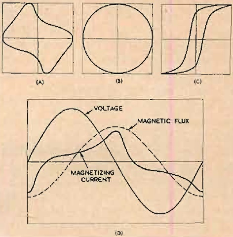 Fig. 5. Trazos asociados con el análisis del núcleo: (A) magnetización de corriente horizontal con voltaje vertical, utilizando una forma de onda de voltaje casi sinusoidal; (B) patrón circular para verificar 90 grados. cambio de fase en la pantalla de voltaje; (C) bucle de histéresis obtenido por 90 grados. cambio en placas verticales; (D) formas de onda mostradas por base de tiempo normal, correspondientes a los patrones de (A) y (C). El flujo magnético se muestra con puntos, porque no se puede mostrar directamente.