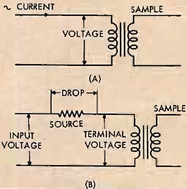 En la Fig. 4, (A) muestra la disposición para medir la corriente de magnetización en un transformador simple por medio de un patrón de osciloscopio. La resistencia R debe elegirse de modo que su caída de voltaje sea una pequeña fracción de la que atraviesa el devanado del transformador, por lo que el voltaje del devanado también es cercano a la sinusoidal. Como el voltaje de línea completo probablemente no será suficiente para producir saturación en el promary de un transformador de salida, el devanado secundario debe usarse para la prueba, dejando el primario en funcionamiento y teniendo cuidado de no acercarse demasiado a los extremos abiertos, lo que producirá un aire acondicionado prohibitivamente grande Voltaje.