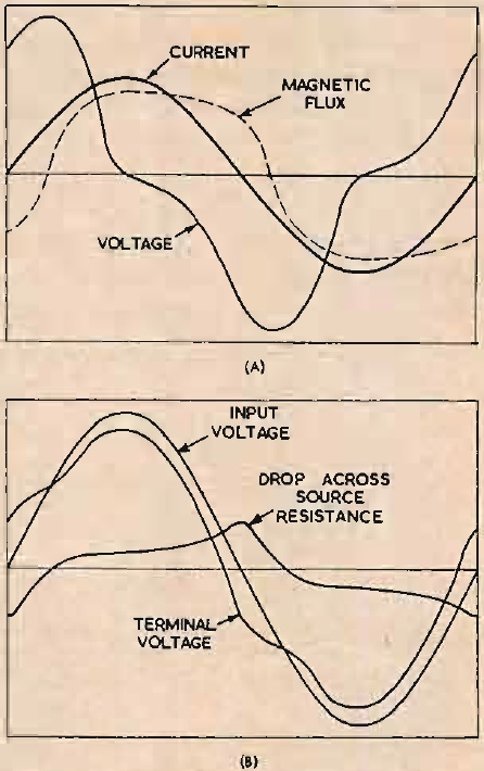 Un pentodo es virtualmente una fuente de "corriente", por lo que al pasar al otro extremo por un momento, podríamos suponer que la corriente es sinusoidal, como se representa en (A) en la Fig. 6. En este caso, el flujo magnético se determinará a partir de el bucle de histéresis y el voltaje, a su vez, son producidos por la tasa a la que varía el flujo en cualquier instante. Las formas de onda producidas se muestran en (A) en la Fig. 7. La corriente y el voltaje pueden, por supuesto, mostrarse en el osciloscopio, pero el flujo magnético sólo podemos deducirlo.