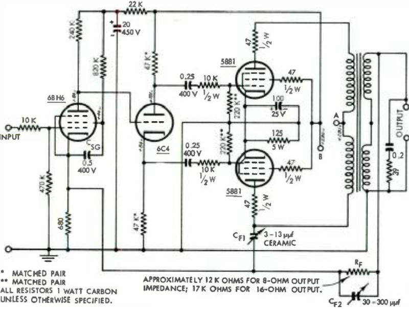 usó. Los valores de 16 o 4 ohmios requerirán un valor diferente de la resistencia de retroalimentación Rf. La impedancia primaria debe estar entre 5000 y 7000 ohmios para el tipo 5881 y válvulas similares.