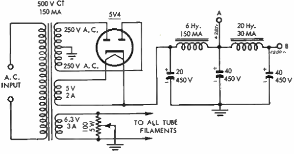 El esquema del amplificador resultante se muestra en la Fig. 1 y su fuente de alimentación en la Fig. 2. Consiste en un amplificador de voltaje de pentodo acoplado directamente a un divisor de fase de triodo de carga dividida, que es una resistencia acoplada a la salida push-pull. pentodos En realidad, se puede pensar en el amplificador como el tipo de pentodo acoplado por resistencia de dos etapas más simple, con el divisor de fase agregado para convertir el diseño en operación push-pull. Este diseño simple y directo no es sorprendentemente nuevo ni siquiera original, pero cumple admirablemente el requisito del menor número posible de etapas y redes de acoplamiento. Esta es la clave inicial para la estabilidad en un amplificador de retroalimentación. La clave final para el alto nivel de estabilidad se encuentra en las tres rutas de retroalimentación, que se discutirán en un párrafo posterior.