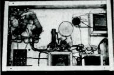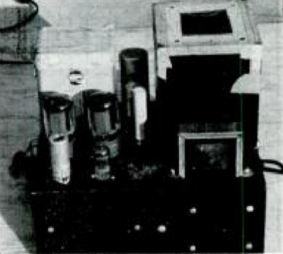 La figura 5 es una vista de una segunda versión del amplificador universal que utiliza rectificadores de silicio en la fuente de alimentación. La cinta de enmascarar utilizada para proteger el acabado de pintura de los transformadores durante la construcción se muestra en la Fig. 5 como una sugerencia útil.