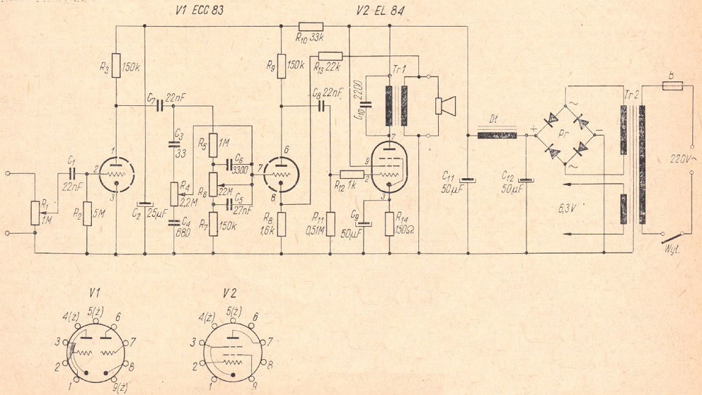 Luego comprobamos que el amplificador no tiende a oscilar. Para ello, giramos "en todas las direcciones" las tres perillas del amplificador simultáneamente: la perilla de control de volumen y dos controles de tono. Aparte del leve zumbido antes mencionado, no se debe escuchar ningún sonido (silbidos, gruñidos, golpes, etc.). Si se presentan tales síntomas (lo que es posible, por ejemplo, con un montaje defectuoso o descuidado), pueden eliminarse aumentando el valor de la resistencia R10 a aproximadamente 50 ÷ 60 kΩ, o aumentando la capacitancia del condensador electrolítico C2, incluso hasta 100 μF. Si resulta ineficaz, puede intentar usar una resistencia en el circuito del cátodo de la primera etapa de ganancia (triodo izquierdo del tubo ECC83 en el diagrama esquemático). Hasta ahora, este cátodo estaba conectado directamente a la barra de tierra. La resistencia puede tener un valor en el rango de 500 ÷ 2000Ω. Al mismo tiempo, el valor de la resistencia de malla de este tubo se puede reducir de 5 MΩ a 1 ÷ 2 MΩ.