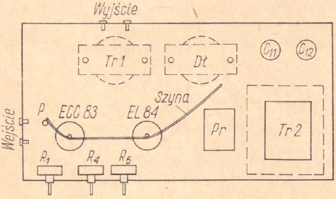 Fig. 6. Un ejemplo de la disposición de los elementos principales del amplificador (vista desde la parte inferior del chasis)
