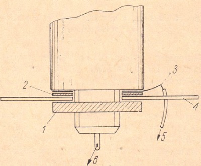 1 - tuerca del condensador, 2 - arandela aislante, 3 - arandela de contacto, 4 - chasis, 5 - al riel de tierra, 6 - al rectificador "+"