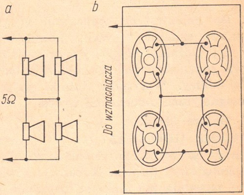 Un altavoz con una resistencia de bobina de 4 ÷ 8Ω puede funcionar con el amplificador. Para aquellos que realmente se preocupan por los buenos resultados, recomendamos utilizar un conjunto de cuatro altavoces GD18-13/2 conectados en serie-paralelo para el amplificador. La forma de montar y conectar los altavoces se muestra en la Figura 8.