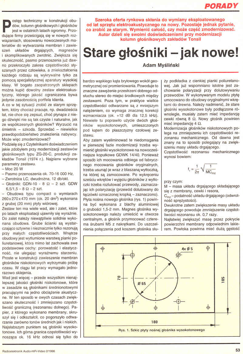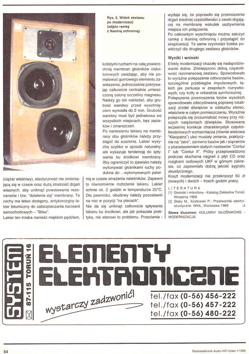 Szeroka oferta rynkowa skłania do wymiany eksploatowanego od lat sprzętu elektroakustycznego na nowy. Pozostaje jednak pytanie, co zrobić ze starym. Wymienić całość, czy może część zmodernizować. Autor dzieli się swoimi doświadczeniami przy modernizacji kolumn głośnikowych zakładów Tonsil.