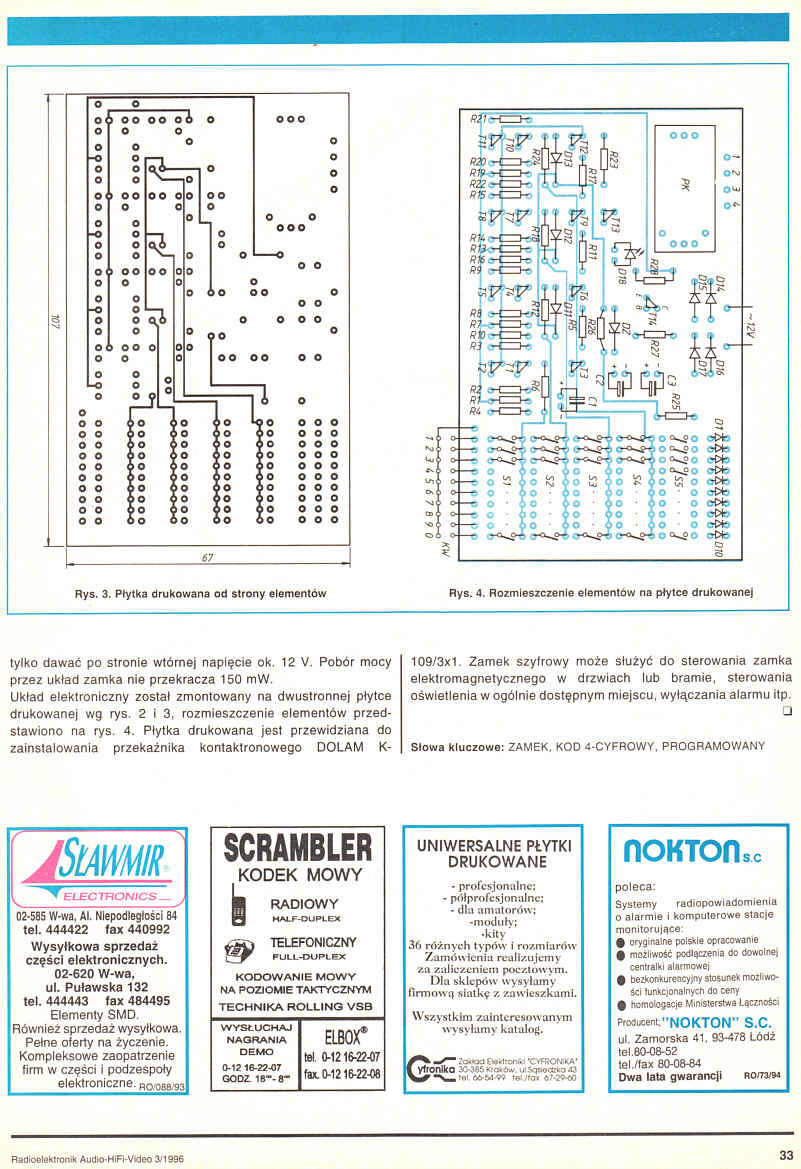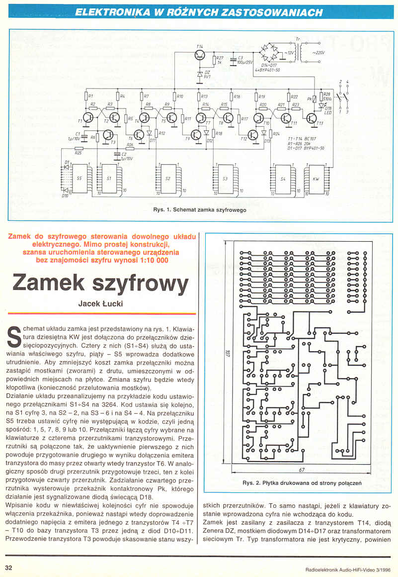 Zamek do szyfrowego sterowania dowolnego układu elektrycznego. Mimo prostej konstrukcji, szansa uruchomienia sterowanego urządzenia bez znajomości szyfru wynosi 1:10000.