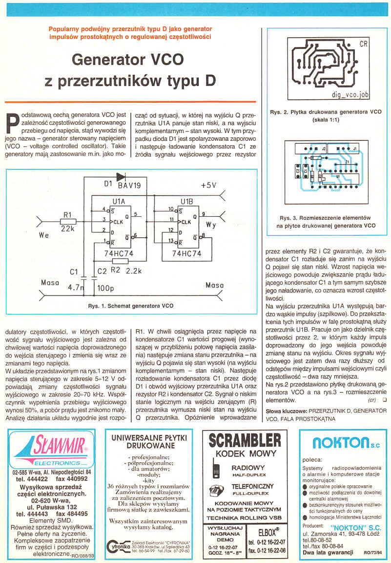 O programowalnych sterownikach logicznych - konstrukcji bardzo kiedyś popularnej w zastosowaniach przemysłowych, a obecnie wchodzącej do szerokiego zastosowania - jeszcze u nas nie było. A tę konstrukcję można zastosować do bardzo różnych celów. - Generator VCO z przerzutników typu D (34)
