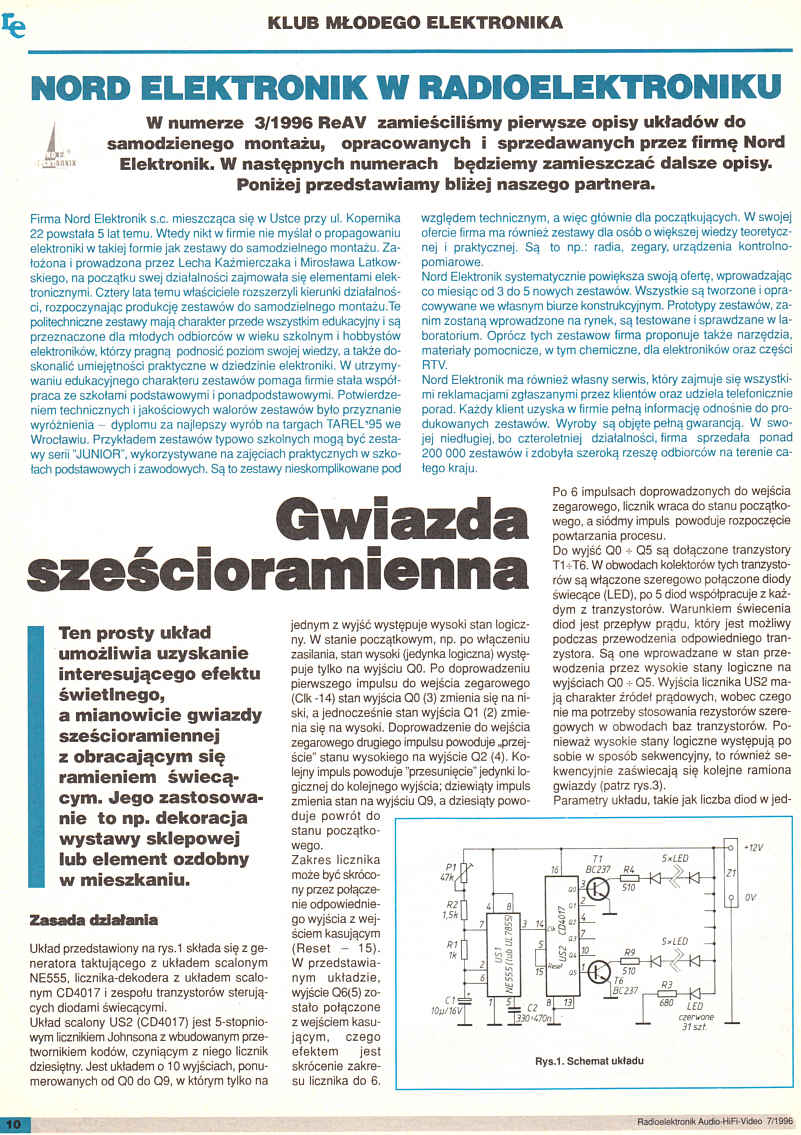 W numerze 3/1996 ReAV zamieściliśmy pierwsze opisy układów do samodzielnego montażu, opracowanych i sprzedawanych przez firmę Nord Elektronik. W następnych numerach będziemy zamieszczać dalsze opisy. Poniżej przedstawiamy bliżej naszego partnera. - Gwiazda sześcioramienna (10)