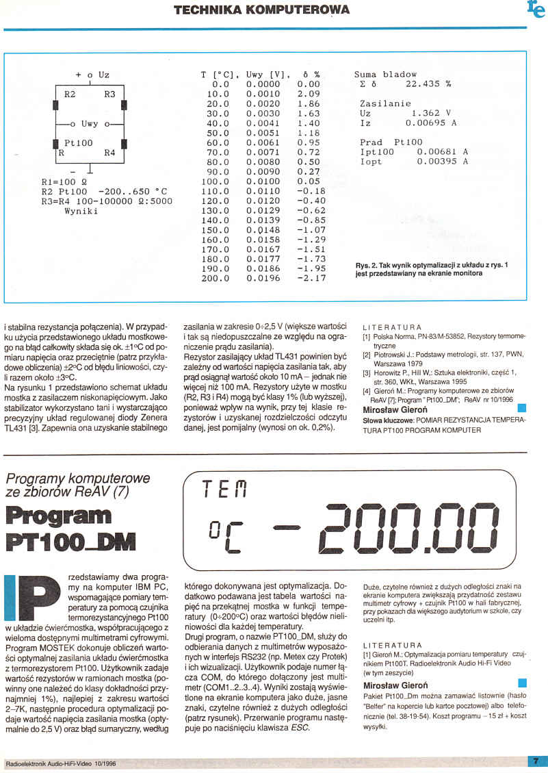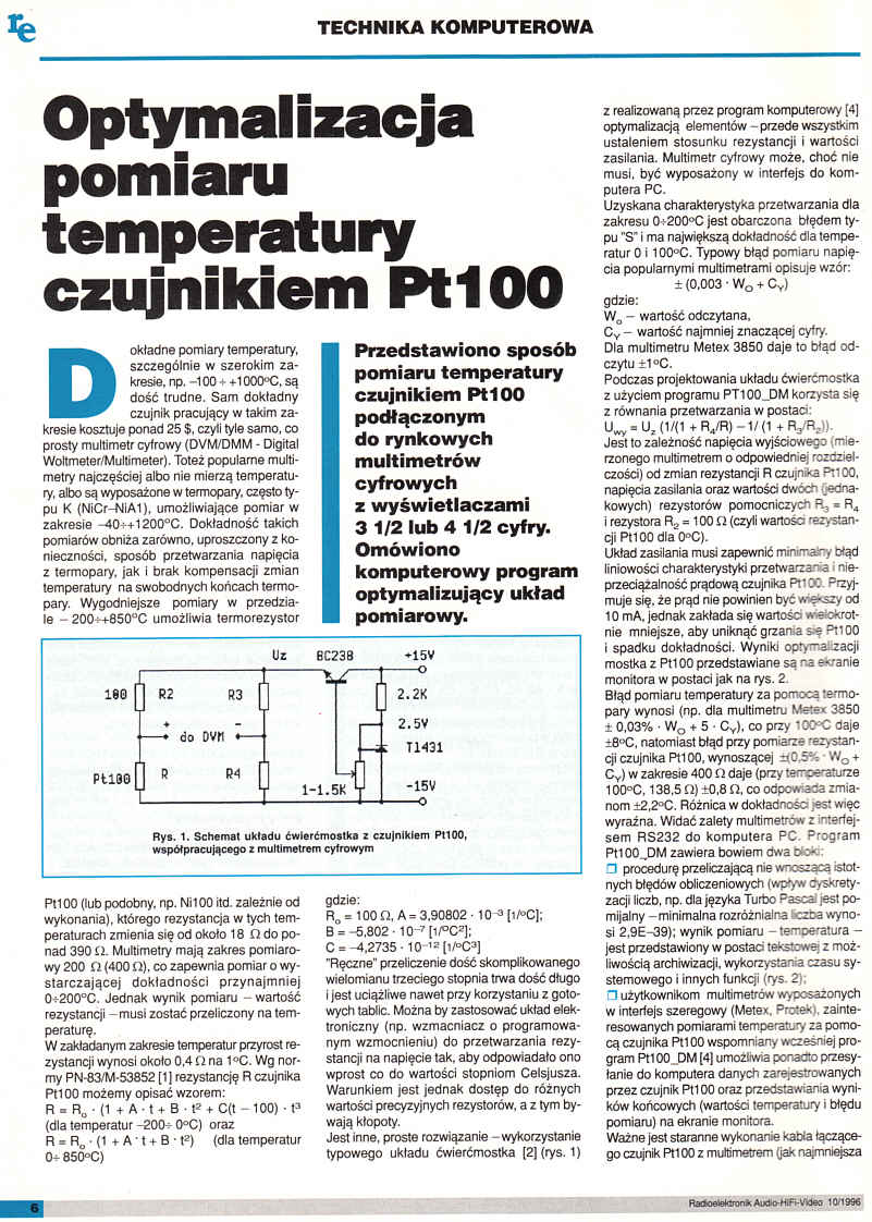 Przedstawiono sposób pomiaru temperatury czujnikiem Pt100 podłączonym do rynkowych multimetrów cyfrowych z wyświetlaczami 3 1/2 lub 4 1/2 cyfry. Omówiono komputerowy program optymalizujący układ pomiarowy.