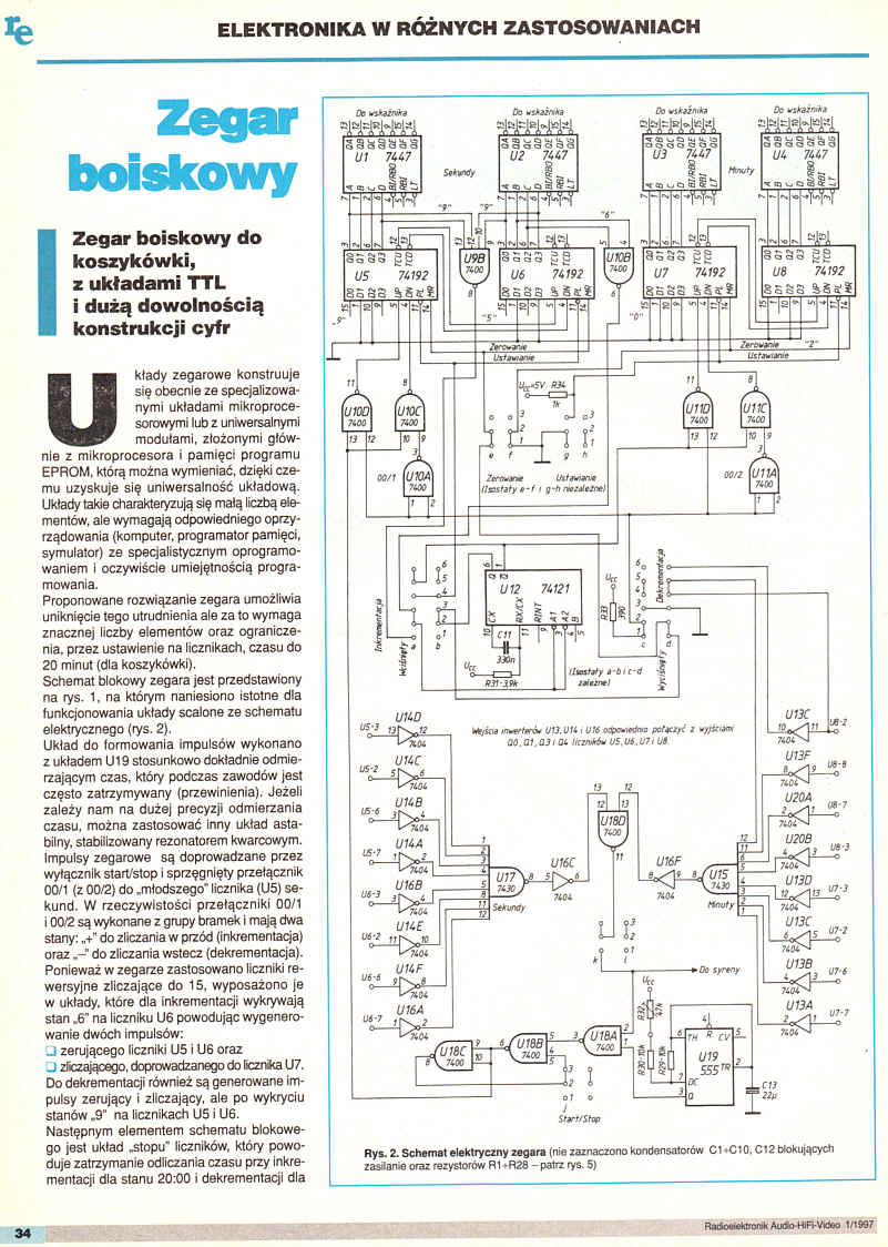 Zegar boiskowy do koszykówki, z układami TTL i dużą dowolnością konstrukcji cyfr.