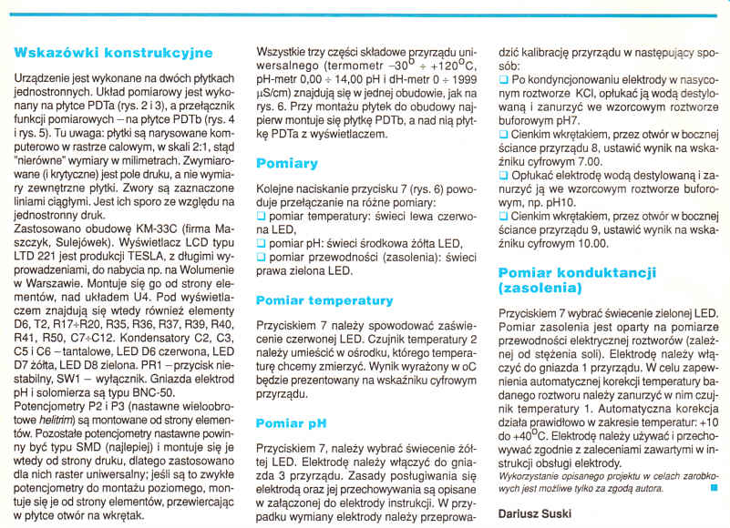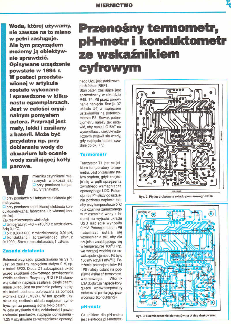 Woda, której używamy nie zawsze na to miano w pełni zasługuje. Ale tym przyrządem możemy ją obiektywnie sprawdzić. Opisywane urządzenie powstało w 1994 r. W postaci przedstawionej w artykule zostało wykonane i sprawdzone w kilkunastu egzemplarzach. Jest w całości oryginalnym pomysłem autora. Przyrząd jest mały, lekki i zasilany z baterii. Może być przydatny np. przy dobieraniu wody do akwarium lub ocenie wody zasilającej kotły parowe.