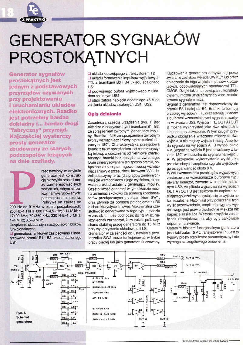 Generator sygnałów prostokątnych jest jednym z podstawowych przyrządów używanych przy projektowaniu i uruchamianiu układów elektronicznych. Rzadko jest potrzebny bardzo dokładny i... bardzo drogi "fabryczny" przyrząd. Najczęściej wystarczy prosty generator zbudowany ze starych podzespołów leżących na dnie szuflady.