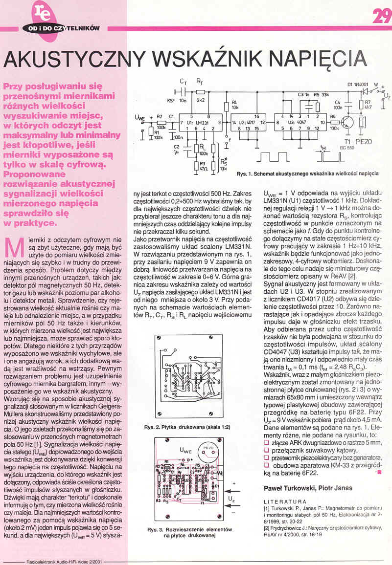 Przy posługiwaniu się przenośnymi miernikami różnych wielkości wyszukiwanie miejsc, w których odczyt jest maksymalny lub minimalny jest kłopotliwe, jeśli mierniki wyposażone są tylko w skalę cyfrową. Proponowane rozwiązanie akustycznej sygnalizacji wielkości mierzonego napięcia sprawdziło się w praktyce.