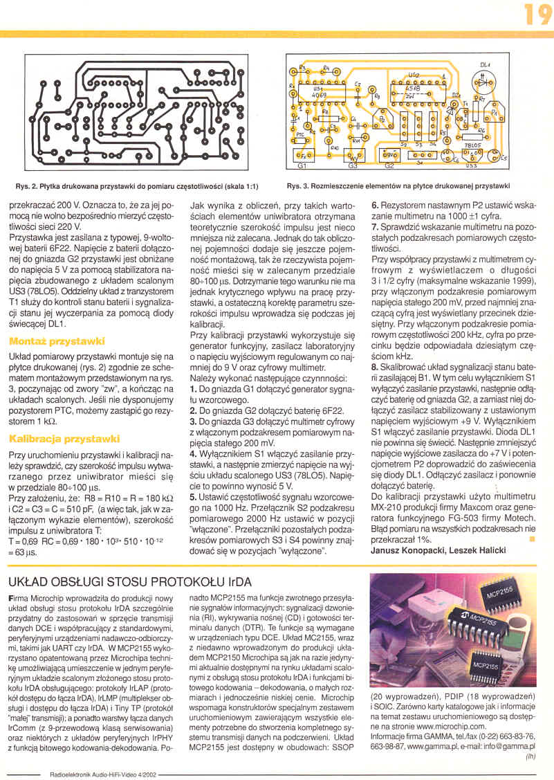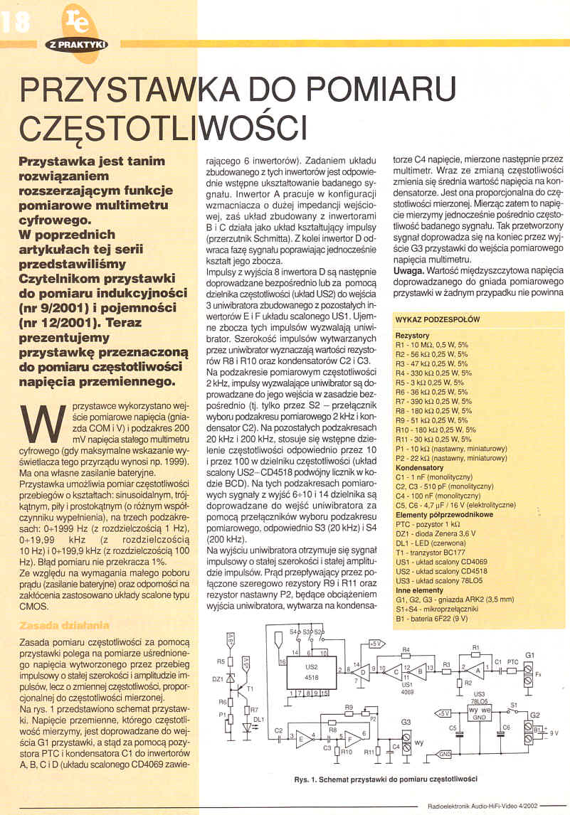 Przystawka jest tanim rozwiązaniem rozszerzającym funkcje pomiarowe multimetru cyfrowego. W poprzednich artykułach tej serii przedstawiliśmy Czytelnikom przystawki do pomiaru indukcyjności (nr 9/2001) i pojemności (nr 12/2001). Teraz prezentujemy przystawkę przeznaczoną do pomiaru częstotliwości napięcia przemiennego.