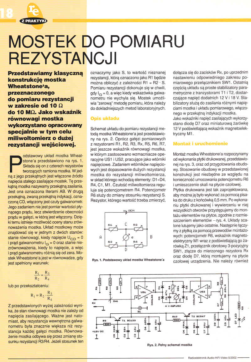 Przedstawiamy klasyczną konstrukcje mostka Wheatstone'a przeznaczonego do pomiaru rezystancji w zakresie od 10Ω do 10MΩ. Jako wskaźnik równowagi mostka wykorzystano opracowany specjalnie w tym celu miliwoltomierz o dużej rezystancji wejściowej.
