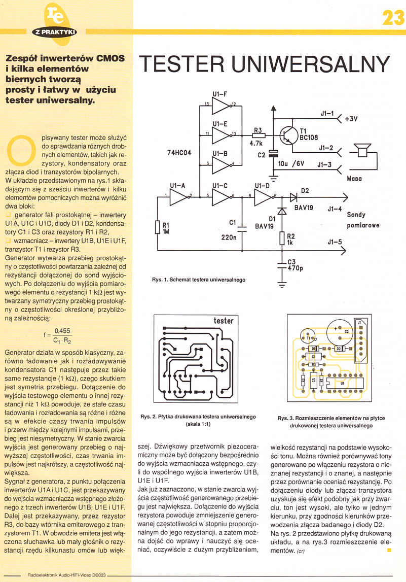 Zespół inwerterów CMOS i kilka elementów biernych tworzą prosty i łatwy w użyciu tester uniwersalny.