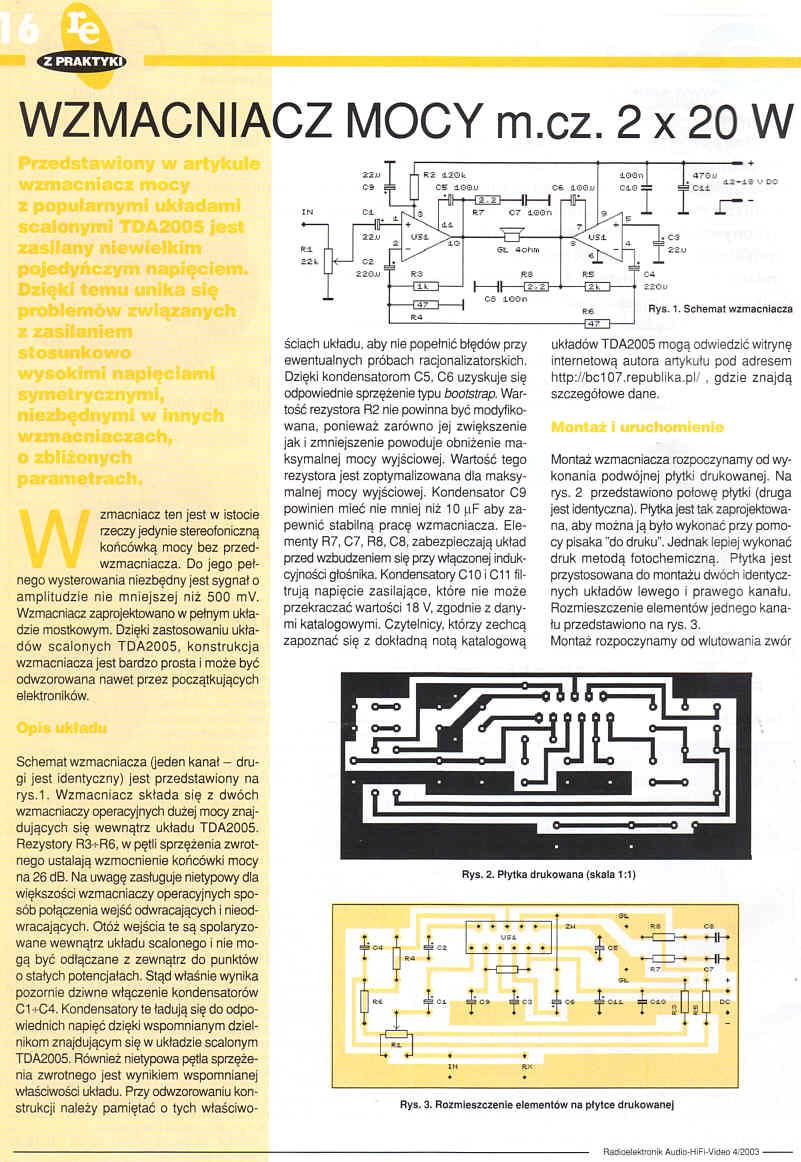 Przedstawiony w artykule wzmacniacz mocy z popularnymi układami scalonymi TDA2005 jest zasilany niewielkim pojedynczym napięciem. Dzięki temu unika się problemów związanych z zasilaniem stosunkowo wysokimi napięciami symetrycznymi, niezbędnymi w innych wzmacniaczach, o zbliżonych parametrach.