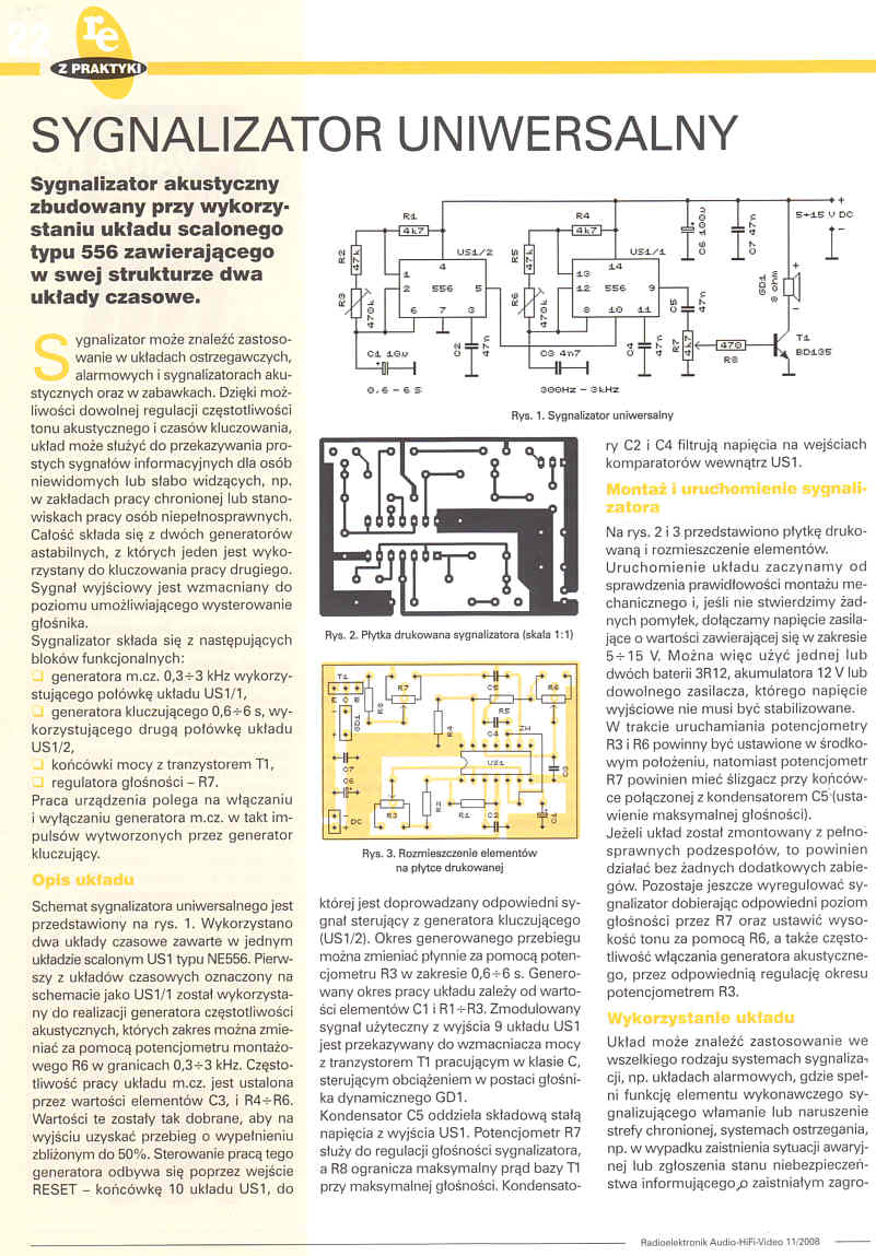 Sygnalizator akustyczny zbudowany przy wykorzystaniu układu scalonego typu 556 zawierającego w swej strukturze dwa układy czasowe (22)