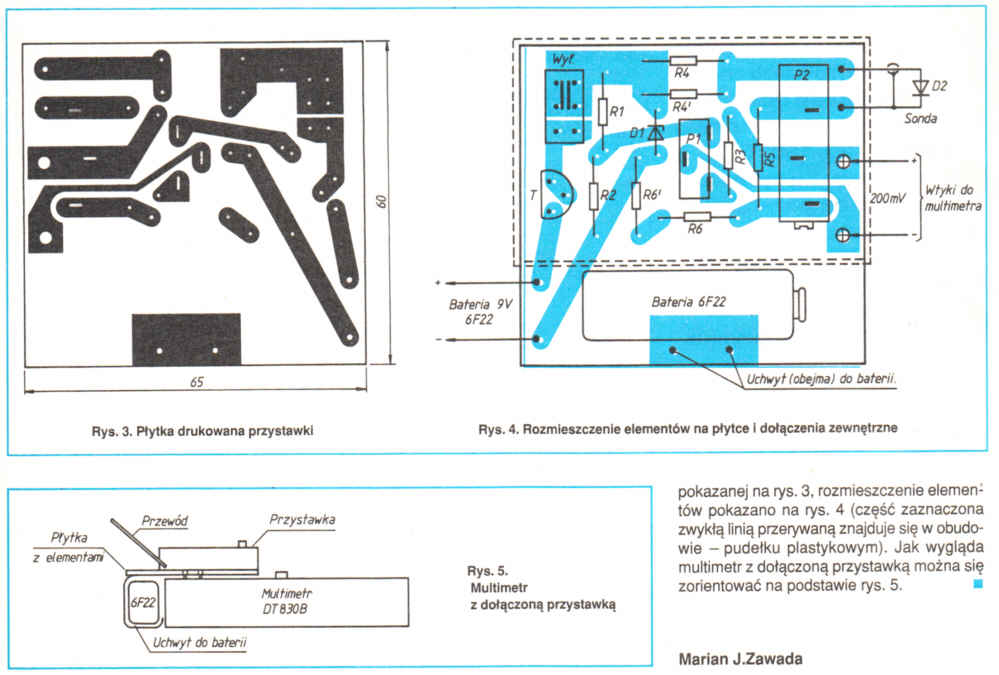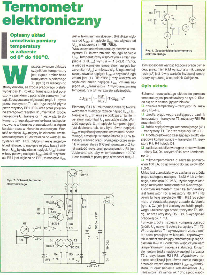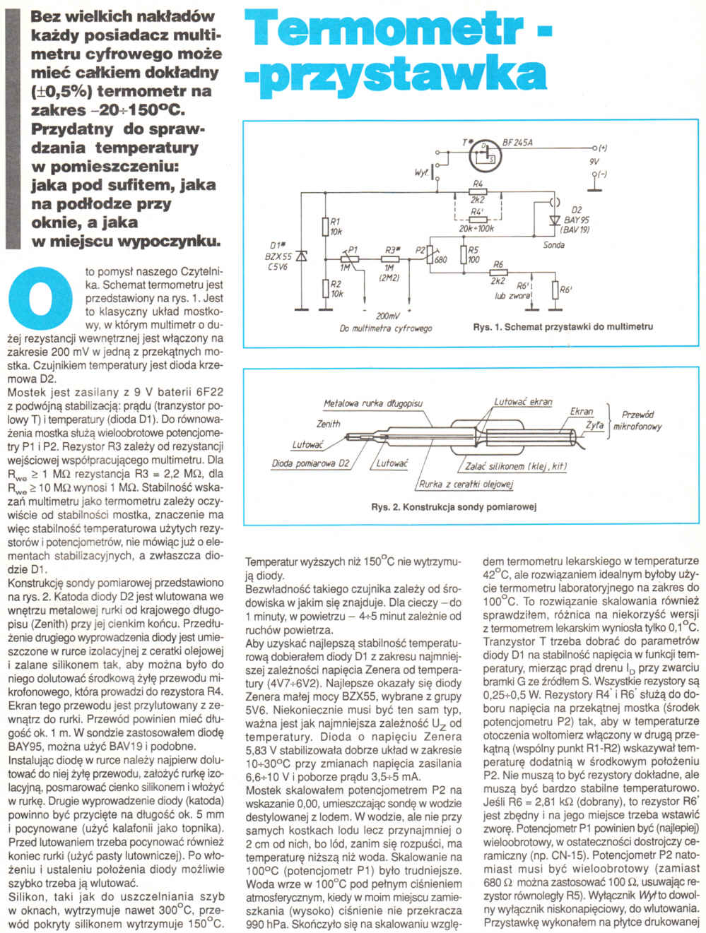 Bez wielkich nakładów każdy posiadacz multimetru cyfrowego może mieć całkiem dokładny (±0,5%) termometr na zakres -20÷150oC. Przydatny do sprawdzania temperatury w pomieszczeniu: jaka pod sufitem, jaka na podłodze przy oknie, a jaka w miejscu wypoczynku.