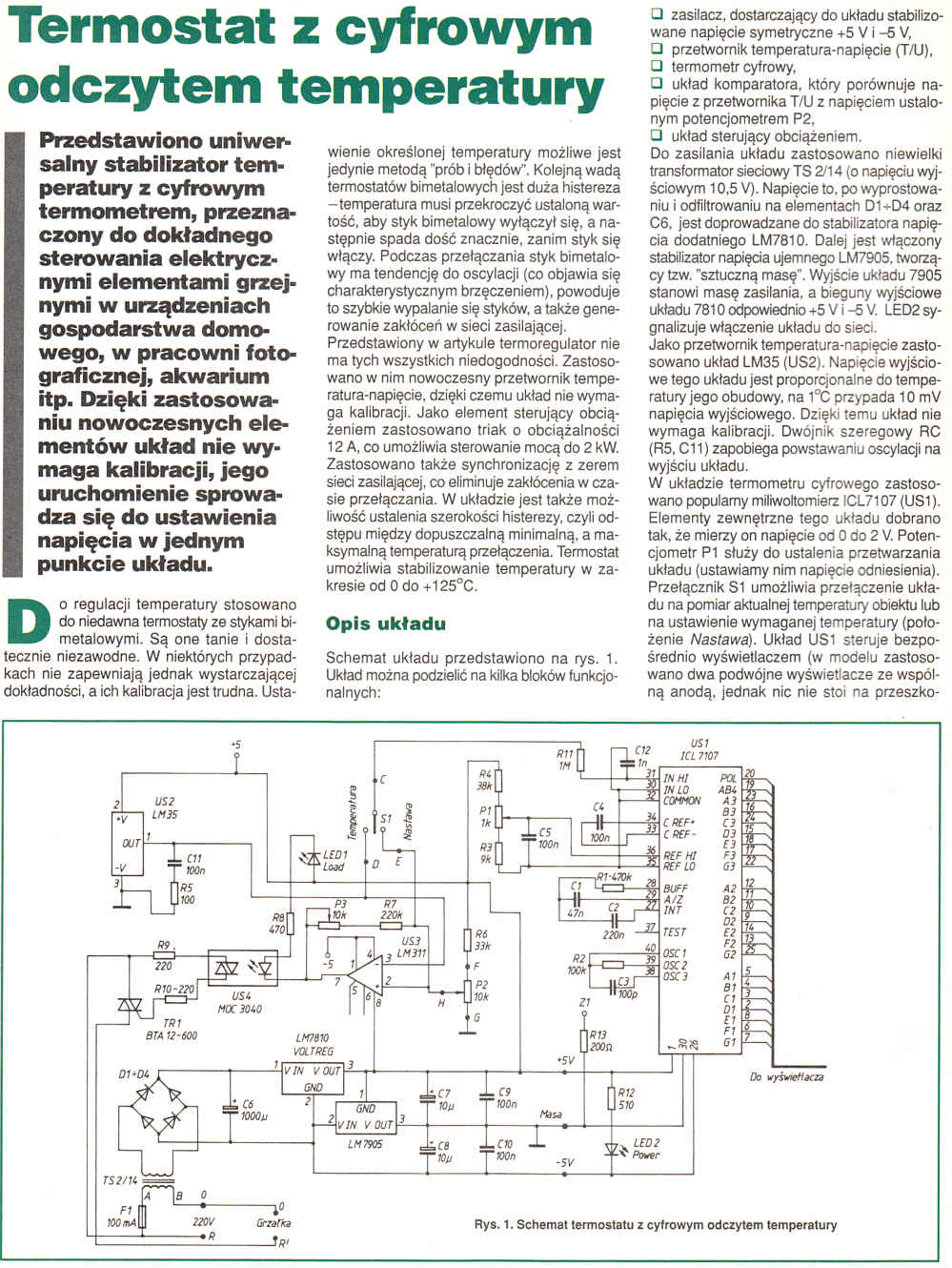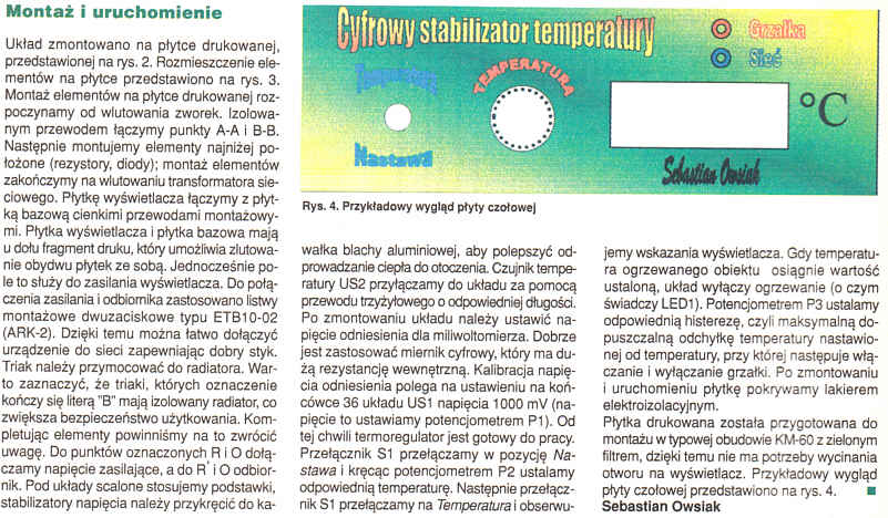 Przedstawiono uniwersalny stabilizator temperatury z cyfrowym termometrem, przeznaczony do dokładnego sterowania elektrycznymi elementami grzejnymi w urządzeniach gospodarstwa domowego, w pracowni fotograficznej, akwarium itd. Dzięki zastosowaniu nowoczesnych elementów układ nie wymaga kalibracji, jego uruchomienie sprowadza się do ustawienia napięcia w jednym punkcie układu.