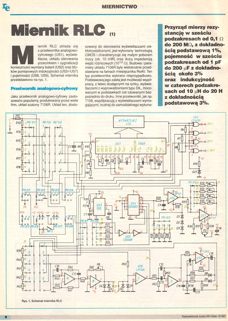 Przyrząd mierzy rezystancję w sześciu podzakresach od 0, oma do 200Momów, z dokładnością podstawową 1%, pojemność w sześciu podzakresach od 1pF do 200uF z dokładnością około 3% oraz indukcyjność w czterech podzakresach od 10uH do 20H z dokładnością podstawową 3%.