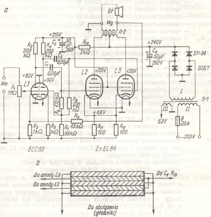 a - schemat ideowy wzmacniacza, b - sposób łączenia uzwojeń transformatora wyjściowego