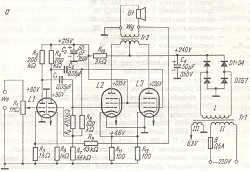 Wzmacniacz małej częstotliwości (rys. 4-11a) składa się ze stopnia odwracającego fazę (lampa L1), stopnia końcowego w układzie przeciwsobnym (lampy L2 i L3) oraz zasilacza. Wzmacniacz jest w zasadzie przeznaczony do odtwarzania zapisu gramofonowego, lecz może również stanowić blok małej częstotliwości w odbiornikach radiofonicznych. Dołączenie stopnia wzmocnienia wstępnego rozszerza zastosowanie tego układu radioamatorskiego, umożliwiając współpracę z mikrofonem, magnetofonem, gitarą elektryczną itp.