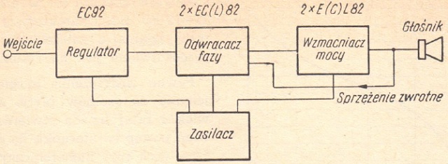 Zastosowany układ odwracania fazy (tzw. "katodyna") jest niezawodny w swej prostocie. W stopniu końcowym pracuje para lamp typu EL84. Oczywiście, zgodnie z wymaganiami współczesnej techniki Hi-Fi, w stopniu tym zastosowano ujemne sprzężenie zwrotne w siatkach ekranujących (tzw. "układ ultralinear"). Siatki te nie są przyłączone - jak to zwykle bywa - bezpośrednio do źródła wysokiego napięcia, lecz do specjalnych odczepów na uzwojeniu pierwotnym transformatora wyjściowego. Stosowanie takiego sprzężenia zwrotnego komplikuje nieco wykonanie transformatora wyjściowego, lecz jest nader opłacalne, gdyż około dwukrotnie zmniejsza zniekształcenia nieliniowe wnoszone przez stopień mocy. Ponadto cały wzmacniacz jest objęty głębokim sprzężeniem zwrotnym, które biegnie od wtórnego uzwojenia transformatora wyjściowego do katody wzmacniacza wstępnego (lewy na schemacie system triody). Zrealizowanie sprzężenia zwrotnego obejmującego cały wzmacniacz jest jest możliwe między innymi dzięki bezpośredniemu sprzężeniu jego dwóch pierwszych stopni.