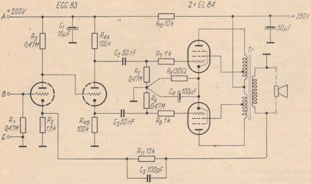 Na rysunku 9 przedstawiony jest schemat ideowy wzmacniacza. Jak widać, ilość lamp i elementów istotnie została ograniczona do rzadko spotykanego minimum. W pierwszym stopniu pracuje jedna z triod lampy ECC83. Anoda tej lampy jest bezpośrednio przyłączona do siatki sterującej następnego stopnia wzmacniacza. Stopień ten, obsadzony drugą triodą lampy ECC83 pracuje w układzie odwracania fazy.