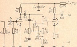 W opisanym wzmacniaczu m.cz. zastosowano dwie takie lampy. Trzecia lampa typu EC92 pracuje jako wzmacniacz wstępny w układzie regulatora charakterystyki częstotliwościowej, czyli mówiąc inaczej - w układzie regulatora barwy dźwięku.