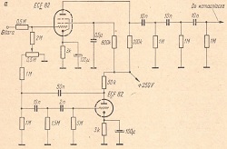 Sygnał wejściowy z potencjometru R1 regulacji siły głosu doprowadza się do siatki sterującej lewej triody lampy L1. Po wzmocnieniu, sygnał ten przechodzi przez kondensator C1 do siatki sterującej lampy L2, a także poprzez dzielnik oporowy R6, R7 do siatki prawej triody L1. Na oporniku R4 powstaje sygnał wzmocniony i przesunięty w fazie o 180o. Doprowadza się go do siatki sterującej lampy L3.