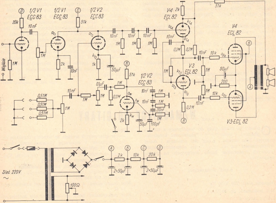 Końcowy stopień wzmacniacza przewidziany jest do pracy w klasie AB. Właściwy dobór ujemnego napięcia siatkowego zapewnia regulowany potencjometr w obwodzie siatkowym lamp. Napięcie polaryzacji należy dobrać w zależności od użytych typów lamp według danych katalogowych.