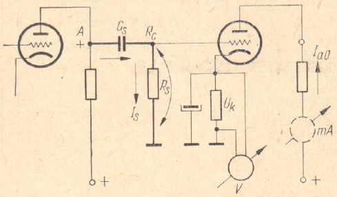 Rys. 1. Badanie izolacyjności kondensatora Cs przez zwarcie siatki lampy z masą i obserwowanie napięcia katodowego Uk lub prądu anodowego Ia0