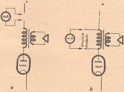 Celem zmierzenia prądu anodowego należy zasadniczo odlutować połączenie od transformatora głośnikowego do plusa napięcia stałego (rys. 1a). Pomiędzy tymi punktami włącza się następnie miliamperomierz, o wychyleniu na pełną skalę rzędu 100mA. Jest to pomiar najzupełniej pewny, choć oczywiście kłopotliwy, ponieważ trzeba w/w połączenie odnaleźć, dokonać odlutowania, a następnie przylutowania.