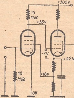 Układ wzmacniacza wskazany na rys. 1 nie posiada żadnego elementu sprzęgającego pomiędzy anodą stopnia pierwszego, a siatką stopnia drugiego. Jest to więc układ nazywany dotychczas wzmacniaczem prądu stałego. Działanie jego będzie prawidłowe, jeśli potencjał katody drugiej lampy względem masy będzie wyższy od potencjału anody stopnia pierwszego, gdyż w ten sposób siatka drugiej lampy będzie ujemną względem swej katody. W zwykłym jednak układzie anoda lampy sterującej wykazuje napięcie względem masy rzędu setki woltów, wynika więc stąd konieczność stosowania wysokiego stosunkowo napięcia zasilającego. Napięcie ponadto powinno być stabilizowane, gdyż zmiana napięcia o np. 10 woltów pociąga za sobą zmianę o kilka woltów, co może mieć bardzo nieprzyjemne skutki przy nowoczesnych lampach głośnikowych o dużym nachyleniu charakterystyki. Układów takich unikano więc o ile tylko możliwe, a tam gdzie były niezbędne, jak np. w niektórych układach pomiarowych, należało przedsiębrać pewne dość skomplikowane środki zabezpieczające.
