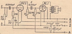 Praca lampy głośnikowej jest w dużej mierze decydująca o funkcjonowaniu całego odbiornika. Miernikiem tej pracy jest zaś między innymi prąd anodowy lampy i dlatego należy go od czasu do czasu skontrolować. Jeśli wartość będzie zbyt niska - będzie to najczęściej dowodem nie dostatecznej emisji lampy, zaszłe zaś na skutek tego zmiany w pracy aparatu, często trudno słyszalne ze względu na stopniowe osłuchanie, warto sprawdzić najlepiej przez chwilową choćby wymianę lampy na nową. Gdy wartość prądu będzie natomiast zbyt wielka, stać się to powinno sygnałem do natychmiastowego wglądu do aparatu. Często powodem wzrostu prądu będzie pojemność sprzęgająca anodę stopnia poprzedzającego z siatką lampy głośnikowej. Gdy izolacja tego kondensatora pogorszy się na skutek jego upływności, na siatkę dostanie się nieco napięcia dodatniego i spowoduje wzrost prądu anodowego. Czasem powodem wzrostu prądu może być zwarcie oporności w katodzie lub w ogólnym minusie. Autor tej notatki miał np. niedawno sposobność naprawić taki właśnie defekt w odbiorniku Aga. Otóż kondensator elektrolityczny, bocznikujący opór 190Ω w ogólnym minusie z którego czerpie ujemne przednapięcie lampa głośnikowa 7C5, został spięty na krótko przez rozpryśniętą kroplę cyny, jaka spadła na jedną z jego ścianek bocznych - prawdopodobnie podczas jakiejś poprzedniej naprawy. W tym stanie aparat grał przez 2 lata (!) aż do zupełnego wyczerpania emisji lampy głośnikowej. Przy skontrolowaniu z pomocą nowej lampy, prąd anodowy w tych warunkach przekraczał 120mA. Wartość normalna wynosi jak wiadomo 45mA. Z tego jednego z licznych przykładów widać, że trzeba i należy kontrolować prąd anodowy lampy. Dodamy jeszcze, że kontrola taka powinna się odbyć zaraz po załączeniu odbiornika, przy czym jedna lub dwie minuty wystarczą do uzyskania miarodajnego odczytu. Niekiedy jednak ostateczne warunki ustalają się dopiero po dłuższym czasie po jednej a nawet kilku godzinach. Niektóre lampy tracą bowiem czasem częściowo izolację lub próżnię po silnym rozgrzaniu i ich prąd anodowy ma tendencję do stałego wzrostu, początkowo powolnego nie zauważalnego, potem szybkiego nawet lawinowego.