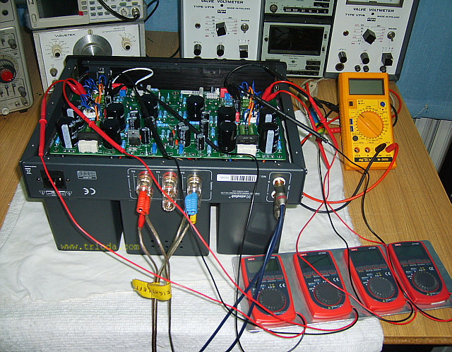 Zrywając z konwencją kolejności zamieszczania fotografii urządzeń w dziale Galeria serwisu WWW.TRIODA.COM, w ramach której pierwsze zdjęcie przedstawia widok ogólny wzmacniacza, a zdjęcia "rozbierane" pojawiają się później, tym razem jako pierwsze zdjęcie pokazuję fotografię, na której wzmacniacz wygrzewa się w trakcie procedury regulacji prądów spoczynkowych po wymianie lamp końcowych.