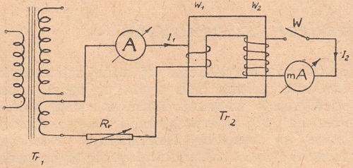 Na rdzeniu transformatora, którego jedno uzwojenie chcemy zbadać, nawijamy jeden zwój grubego (około 1mm) izolowanego drutu. Ten jeden zwój łączymy przez regulowany opornik Rr i przez amperomierz na prąd zmienny A, z uzwojeniem żarzenia jakiegoś innego transformatora Tr1 (np. o napięciu 4V), którego użyjemy jako źródła prądu w naszym pomiarze. Uzwojenie transformatora Tr2 na którym dokonujemy pomiaru, łączymy przez wyłącznik W z czułym miliamperomierzem na prąd zmienny mA. Najpierw obwód uzwojenia badanego pozostawiamy otwarty (wyłącznik W otwarty!).