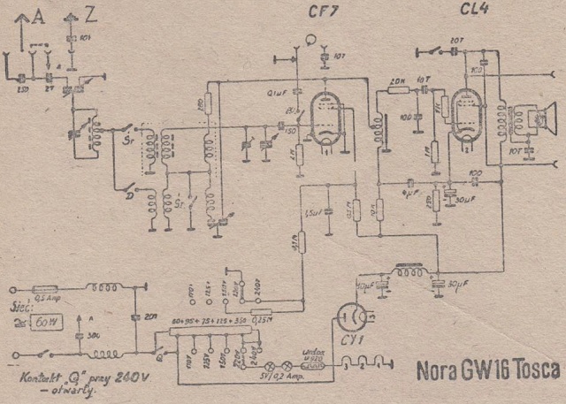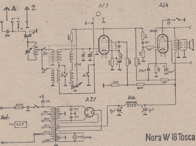 Na zamieszczonych schematach przedstawione są połączenia w odbiornikach produkcji 'Nora" typów "Tosca" "W16" i "GW16". Oba odbiorniki są dwulampowe z trzecią prostowniczą, dwuzakresowe (fale średnie i długie) oraz należą do kategorii aparatów prostych. Obwody strojone i układ częstotliwości odbiorczej posiadają one identyczny, różnią się natomiast w sposobie zasilania prądem elektrycznym oraz typami lamp. Odbiornik "Tosca" "W16" zasilany jest prądem zmiennym z sieci oświetleniowej i posiada pierwszą lampę typu AF7, która spełnia rolę detektora. Druga - jest głośnikową typu AL4. Lampa prostownicza typu AZ1 pracuje w zasilaczu anodowym.